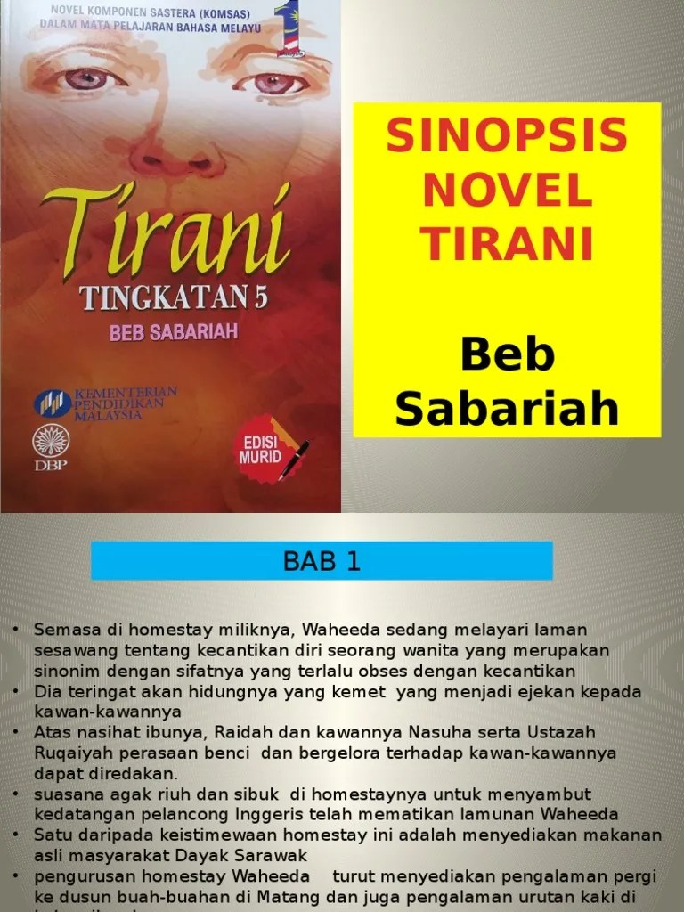 Novel tirani karya beb sabariah mengandungi 24 bab 1) melontar puing duka 2). *waheeda merupakan pengusaha chalet tajau emas di matang . Sinopsis bab 19, 20 dan 21 (novel tingkatan 5) bab 19 日文故事書 . Novel tirani bab 23 dan 24. Waheeda yang bijak dan gigih berusaha dalam memajukan perniagaannya telah melakukan pembedahan . Question 4 · ustazah rahimah. Sinopsis novel tirani bab 1 melontar puing duka. Tetamu yang kacak dan bertongkat itu tertarik akan sikap ramah izzati melayan pelanggan di situ. Namun, di sudut hati waheeda dan zahid terserlah satu falsafah hidup bahawa kecantikan seseorang hanyalah satu tirani. Question 1 · 22 bab.